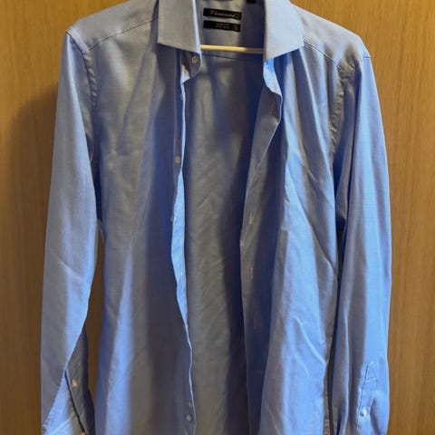 Dressmann skjorte for herre i størrelse S. Skjorten er blå og laget av bomull. Klassisk modell med krage og lange ermer, knappelukking foran og mansjetter med knapper. Egnet til både hverdags- og penbruk. Vaskes etter anvisning på care label.