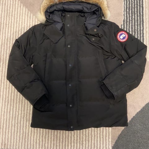 Canada Goose vinterjakke for herre i størrelse L. Jakken er grå og fylt med dun. Den har hette med pelskant, ribbestrikkede mansjetter og frontlukking med glidelås og knapper. Klassisk Canada Goose-logo på ermet. Egnet som varm ytterjakke i kaldt vær.