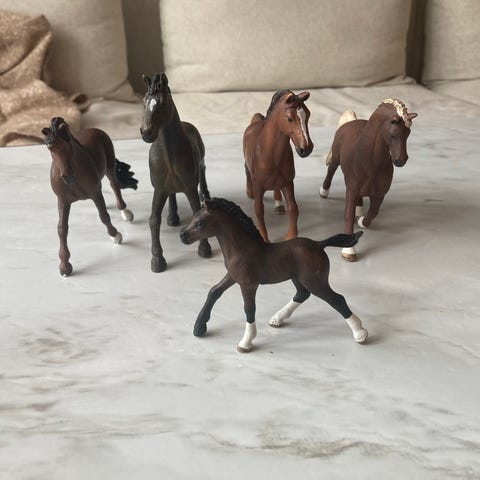 Stor samling med Schleich hestefigurer i ulike størrelser og farger, samt ryttere og tilbehør. Et populært kvalitetsmerke og perfekt for både lek og samlere.