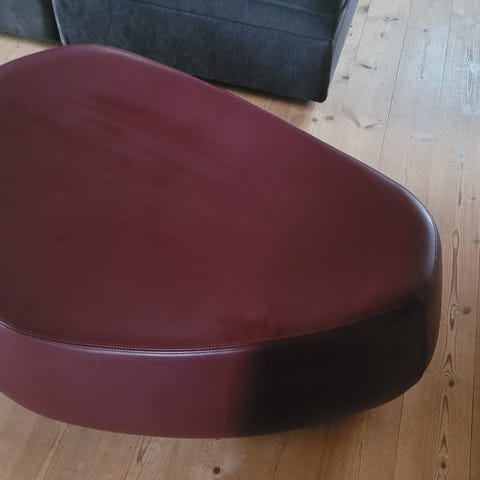 Stor, lav puff i dyprød farge. Den er brukt, men veldig lite. Denne er ganske robust, og setet er tykt polstret. Se bildene for 2 bittesmå merker. Disse påvirker ikke sittestandard eller utseende.