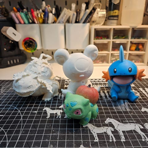 Div. FDM 3d-printet samling med seks figurer: to figurer inspirert av Baby Yoda/Grogu fra Star Wars, én figur inspirert av Groot fra Marvel, én figur inspirert av Kirby, en nøkkel inspirert fra Disney, Maleficent, og en figur inspirert av Luna fra My Little Pony. Alle er frittstående figurer som kan brukes som pynt eller samleobjekter. Alt er håndmalt.