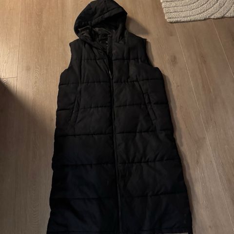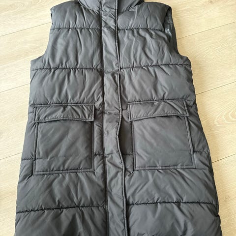 Amisu lang damevest i svart polyester i størrelse XXS. Vesten er vattert og har hette med snøring. Lukkes med glidelås og trykknapper foran. Modellen har skråstilte lommer i sidene og quiltet mønster. Egnet som yttervest til hverdagsbruk i overgangssesonger eller på kjølige dager.