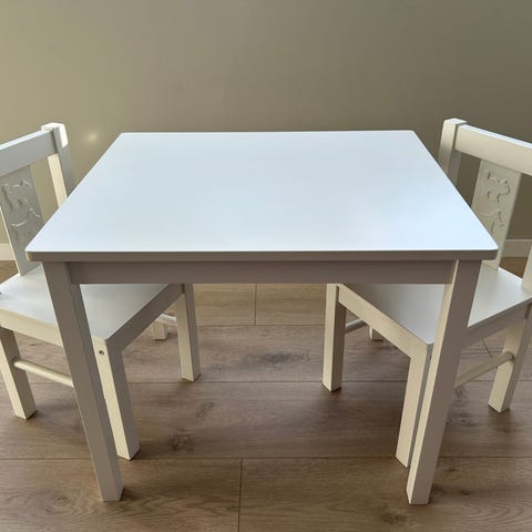 IKEA barnesett med bord og 2 stoler i hvit farge. Sett i barnehøyde, egnet for barn til lek, tegning og andre aktiviteter. Bordet har rektangulær bordplate og rette ben. Stolene har ryggstøtte og sete i samme materiale og farge som bordet. Passer i barnerom, lekerom eller andre oppholdsrom der barn trenger et eget bord- og stolsett. Må hentes.