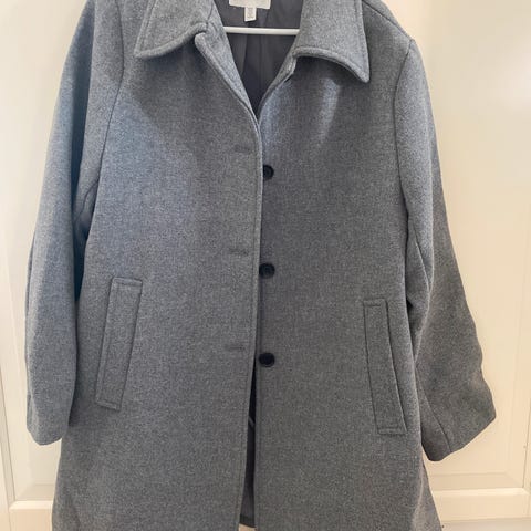 Claire kåpe i ull for dame i størrelse 42. Kåpen er grå og har dobbeltspent knepping med dekorative knapper foran. Modellen har krage og lang lengde, samt lange ermer. Innsiden er helfôret for økt komfort. Egnet som yttertøy i kjøligere vær.