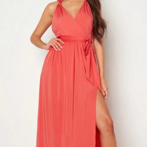 Maxikjole fra Nelly med splitt, str. XL. Kjolen har V-utringning foran og smale skulderstropper. Innsnitt i livet og body under et langt skjørt med dobbel splitt.