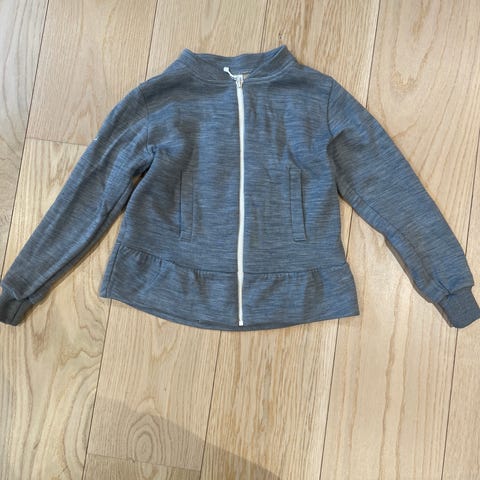 Fin hettejakke i str. 122-128 fra Woolland til salgs. Selve jakken er pent brukt, men den har fått et lite hull nederst på ryggen, se bilde. Hullet er lett å stoppe med litt mørkeblå tråd.
