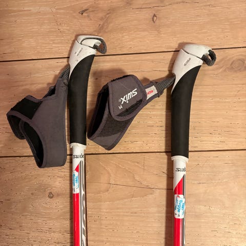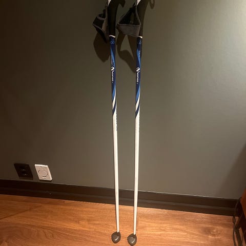 Swix skistaver i blå og hvit farge. Stavene har håndtak med stropper og tradisjonelle trinser nederst. Egnet til langrenn eller turbruk. 142,5 cm