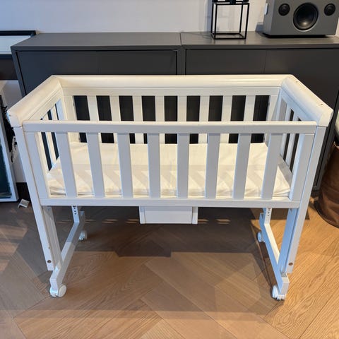 Sengen har en åpen langside som kan plasseres ved siden av en voksenseng for å være nær barnet.