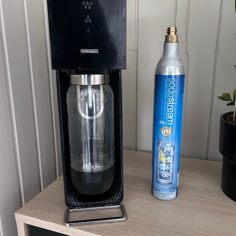 Sodastream kullsyremaskin i svart farge. Maskinen brukes til å lage kullsyrevann hjemme ved hjelp av CO₂-sylinder (ikke synlig på bildene). Med følger to Sodastream-flasker i plast med skrukork i metall. Maskinen har manuell betjening på toppen og strømledning synlig på bildene. Egner seg til bruk på kjøkkenbenk for karbonering av vann i medfølgende gjenbruksflasker. Merke på maskin og flasker er Sodastream.