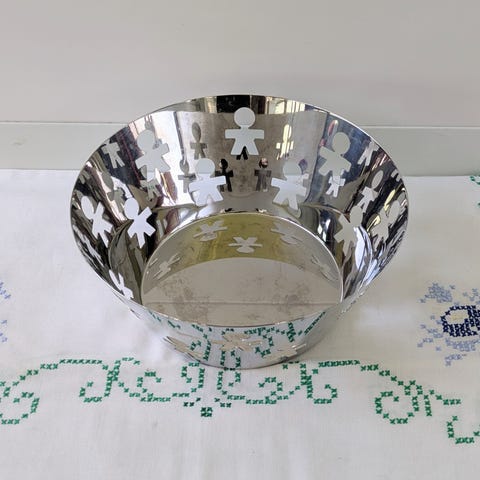 Alessi (Girotonde) fruktskål i rustfritt stål med utskårne figurmotiver rundt hele bollen. Egnet til servering av frukt, brød eller snacks, eller som dekorativ skål på bord eller kjøkkenbenk.