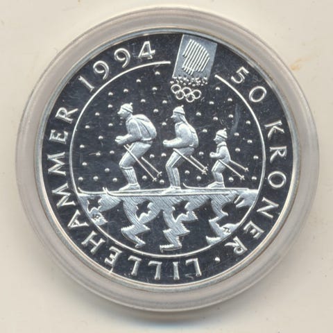 50 kr. Sølv Lillehammer 1994 inneholder 1/2 unce rent sølv