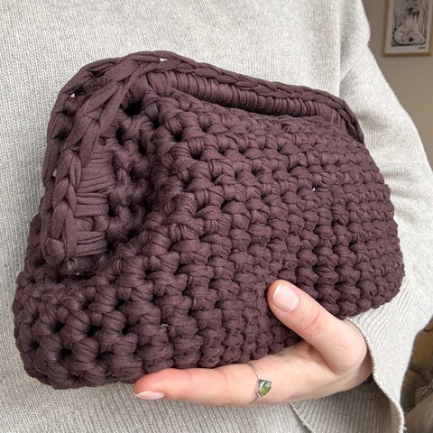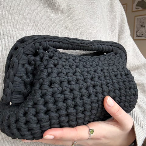 Hjemmeheklet clutch/vesk i hvit. Det er heklet inn metallhåndtak på 22 cm så den er ordentlig lukket og ting ikke faller ut. Også hull til å holde hånda igjennom. Ca. 24cm bred og 17cm høy. God plass til typ tlf, nøkler, lipgloss osv🥰