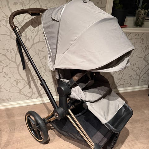 Cybex Priam barnevogn i grå farge. Vognen har liggedel med kalesje og understell med fire hjul og varekurv under. Håndtaket er trukket i materiale som etterligner skinn. Modellen er egnet fra nyfødt med liggedel, og understellet kan også brukes med annen kompatibel sittedel eller bilstol fra Cybex-serien dersom man har dette separat. Passer til både korte trilleturer og lengre turer på variert underlag.