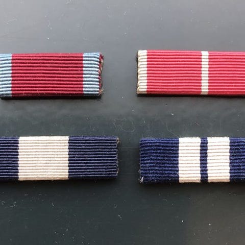 Jeg selger ei slik båndstripe til Krigskorset. Eldre modell, laget for å sy på uniformen. Følgelig må den knytte seg til tildelinger under andre verdenskrig. Den måler ca 3,3 x 1,1 cm. De er ganske sjeldne disse båndstripene nå.