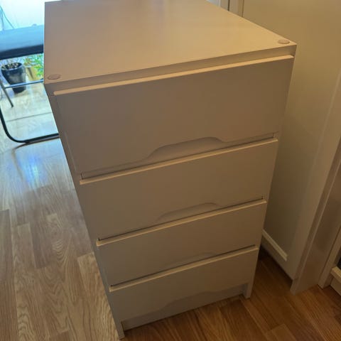 Denne lille kjekke kommoden kan enten være under skrivebordet eller stå frittstående. Desverre er låsen gått sund men skuffene kan fint åpnes. Står på hjul, så den er lett å flytte selvom den er tung.