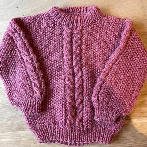 Hjemmestrikket Dahliagenser, bestilt strikket etter mål til min jente, nydelig farge. Hun likte dessverre ikke genseren like godt som meg ,derfor er den lite brukt. Mål: 49 cm lengde på bol. 41 cm bredde på bol. 58 cm fra skulder til håndledd. 34 cm lengde fra armhule til håndledd.