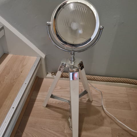 Gulvlampe utformet som en stativlampe i metall med sølvfarget finish. Lampen står på et tredelt stativ med justerbar høyde og kjede mellom beina for stabilitet. Lampeskjermen er montert i en svingbar holder slik at lysretningen kan justeres. Passer som belysning og dekor i stue, kontor eller andre oppholdsrom. Kjøper betaler frakt
