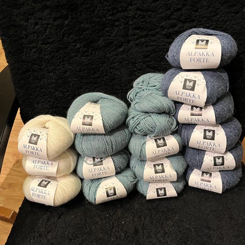 Stor pakke med Pus garn fra Du store Alpakka. Mykt og varmt alpakkagarn som ikke klør