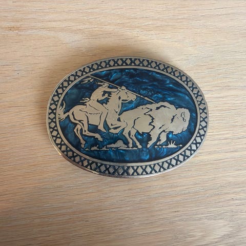 Beltet er laget i kraftig, ekte skinn og har tung metallspenne med original patina. Et tydelig statement-belte og et samlerobjekt innen mid-century tilbehørsdesign.