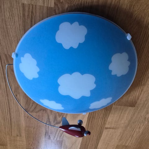 Morsom taklampe til barnerommet med et fly i en streng som «flyr» over «himmelen og skyene» på lampen.