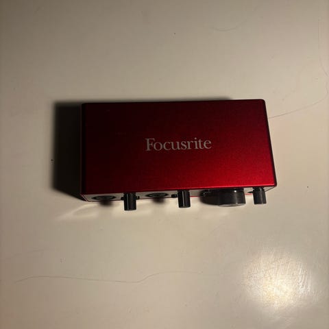 Focusrite Scarlett 2i2 lydkort i rød utførelse.