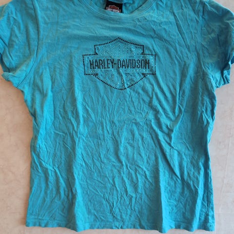 Harley-Davidson T-skjorte for dame i størrelse XL. T-skjorten er rosa og laget av bomull. Den har trykk med Harley-Davidson-motiv både foran og bak. Kortermet modell med rund hals. Den er litt liten i størrelsen. Knapt brukt.