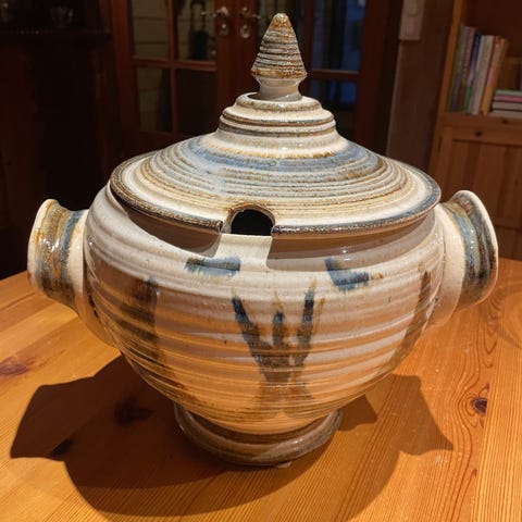 Vintage tekanne i keramikk i nydelig blå farge. Med rottinghåndtak og i veldig god stand. Kan sendes.