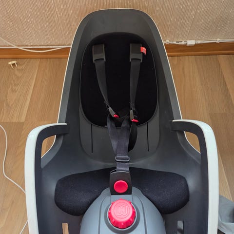 Praktisk barnesete til sykkel med sele og fotstøtter.