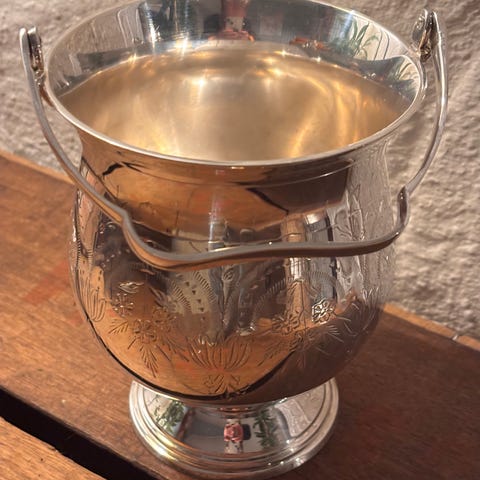 Usikker på hvor gammel den er, men forholdsvis’ tung. Har en sølvkant med hank. Følger også med en skje.