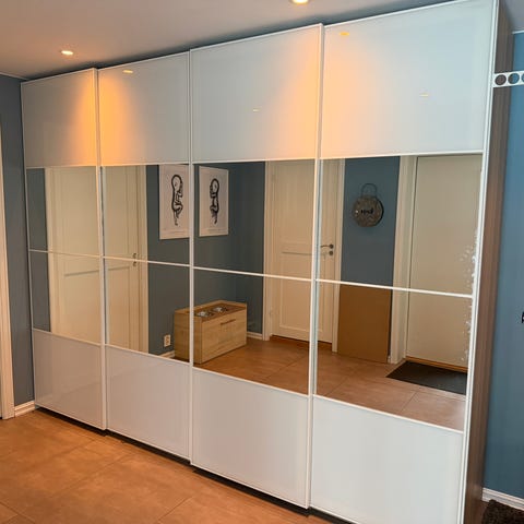 Selger to skyvedører med skinner til Ikea Pax skap. Den ene døra er speil, den andre som på bildet. Skapet ble demontert før jeg fikk tatt bilder av begge dørene.