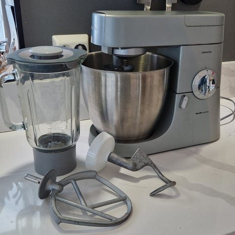 Kenwood kjøkkenmaskin i hvit utførelse med bolle i rustfritt stål. Maskinen har betjeningshjul på siden for regulering av hastighet. Egnet til elting, pisking og blanding av ulike typer deig og rører på kjøkkenet. Passer til daglig bruk i matlaging og baking.Bare 4 år gammel og lite brukt Noe tilleggsutstyr