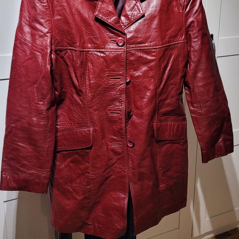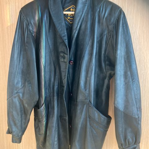 Kul jakke i bøffelskinn. Tror innsiden er stoff av ull. Ingen merker inni jakken til å se hvem som har laget den eller hvilken størrelse. Jeg antar at det er størrelse L. Jeg bruker strl s/m så den er litt oversized, har også brukt den med belte.
