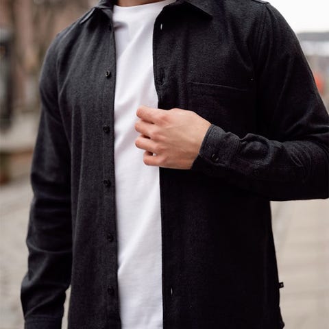 En knapp har falt av, men kan denne kan lett sys på igjen. Knappen følger med i lommen på skjorta. Tett passform.