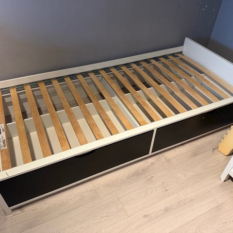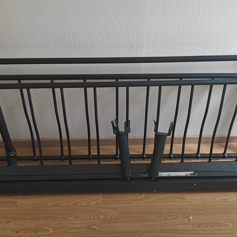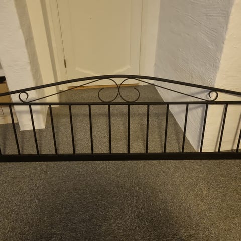 Pen seng. Dekorativ med endestykker og langs den ene siden i sort metall. Den står demontert med alle skruer i pose.