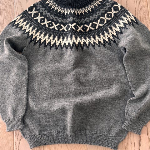 Helt ny potegenser strikket i fritidsgarn ( grå ) og vams ( grønn ) 100 % ull. Kr 500.