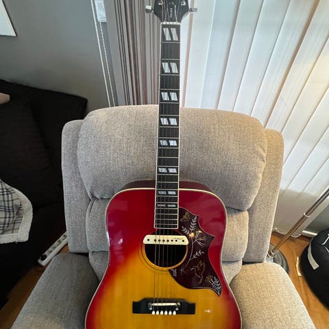 Gitaren er i strålende stand. Bein hals og ingen tegn til at den har stått for tørt.