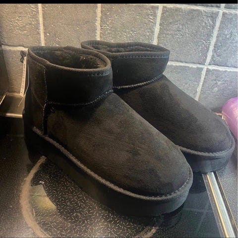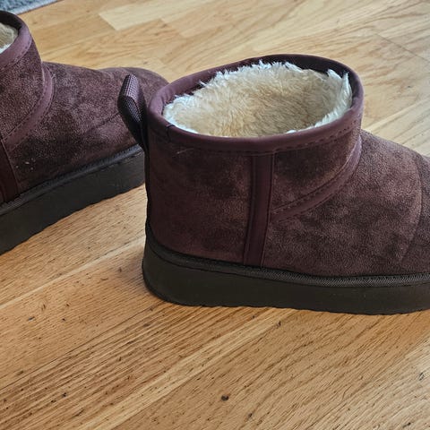 UGG støvler i størrelse 42. Støvlene er i grå farge med mykt, fôret innvendig materiale som gir god isolasjon. Overdelen ser ut til å være i semsket materiale, og sålen er tykk med platå for ekstra høyde og støtte. Passer til bruk i kjøligere vær og til hverdagsbruk der man ønsker varme og komfortable sko.