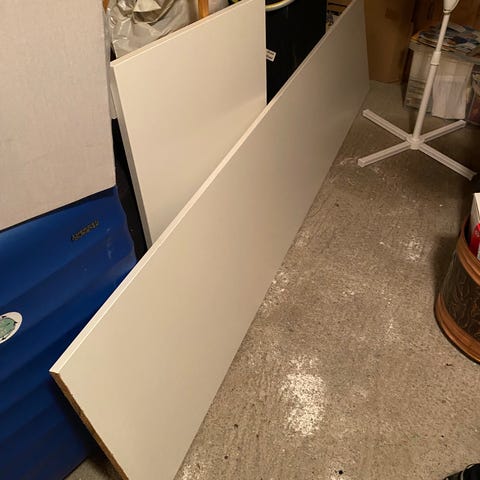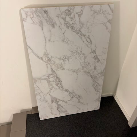 Vi hadde for store ambisjoner. Vi skulle bygge et åpent lite baderoms skap- så langt kom vi ikke. Håper andre har lyst til å prøve. Mål på platen lengde: 123, bredde 49, tykkelse ca 1,9cm