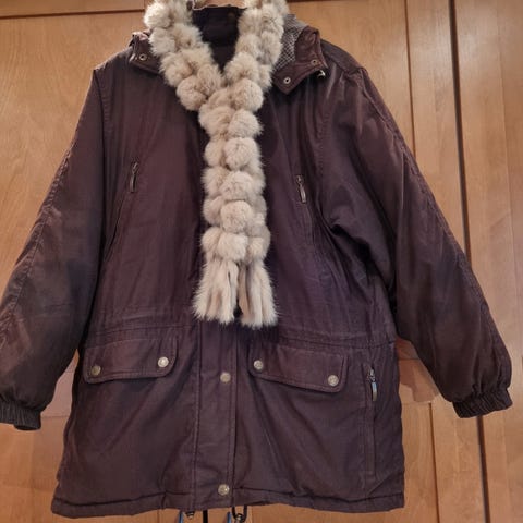 Den er brun med shimmer i fargen og juksepels på kragen.