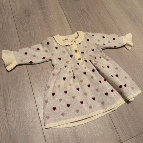 Name it kjole i ull til jente i størrelse 104. Kjolen er kremhvit med lange ermer og rund hals. Den har to røde hjerteapplikasjoner foran og bølgekant nederst på skjørtet. Materialet er myk ull som egner seg godt til kjøligere dager. Passer til hverdagsbruk eller enklere penbruk.