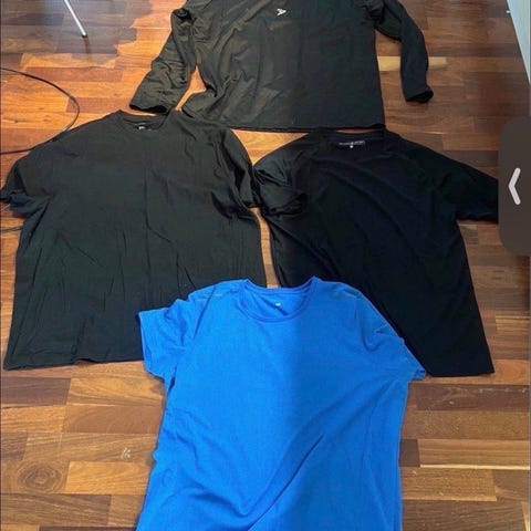 Selger seks Gymshark onyx v5, brukt kun en gang så er så god som ny, 400 kr per stykk, tre longsleeves å tre shortsleeves. S blå i longsleeve er solgt