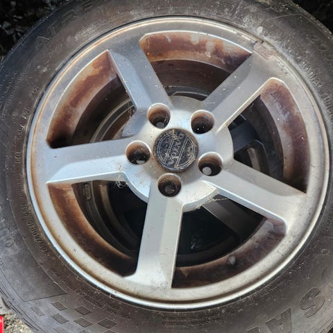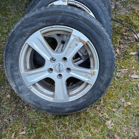 To komplette sett med felger og dekk. Det ene settet har stått på en Ford Forcus, og de andre har stått på en Kangoo.