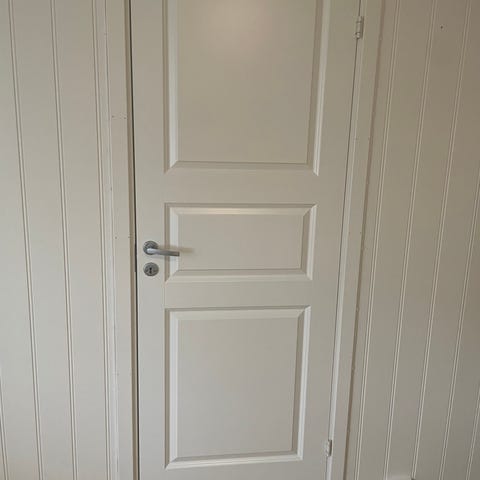 Innerdører måler 204 x 72 cm. Dørene leveres med matchende dørkarmer. De passer som innerdører til boliger eller lignende bruksområder. Fargen som vises på bildet er hvit. Dørene har hull for håndtak og lås, samt en lås.