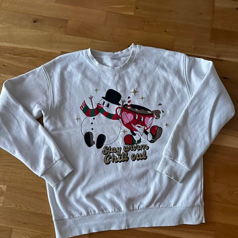 KappAhl T-skjorte for jente i størrelse 164. T-skjorten er hvit og laget av bomull. Fronten har trykk med teksten "Holly & Jolly Vibes" samt motiv av pepperkakemann, juletre og stjerner. Passer som hverdagsplagg eller til jule- og vinterrelaterte anledninger.