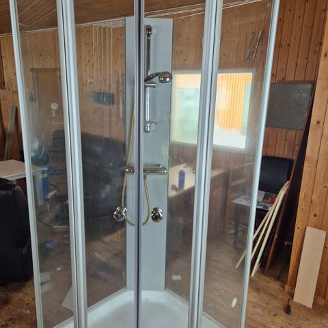 Dusjkabinett for montering i hjørne. Kabinettet har buede glassdører i klart glass og profiler i metall. Det står på en dusjkar-bunn med strukturert overflate. Innebygd dusjgarnityr med hånddusj og blandebatteri er montert på veggprofilen. Passer til baderom med flislagt gulv og sluk i nærheten av kabinettet. Mål og tilkoblinger bør kontrolleres opp mot eget bad før montering.