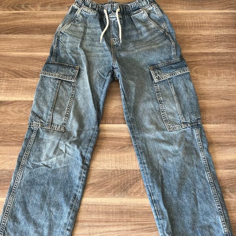 Baggyjeans er dessverre litt slitt nederst ved kanten da den var litt lang til sønnen. Vises ikke ved bruk 🙂