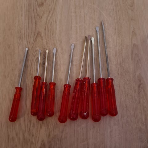 Plastkasse fylt med et variert utvalg skrutrekkere. Ulike størrelser og typer, både korte og lange. Tydelig brukt, noe rust og slitasje, men mye fullt brukbart. Selges samlet som vist, se bilder for innhold og tilstand 🔧🪛