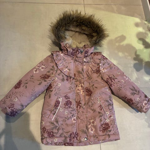 Newbie jakke for jente i størrelse 104. Jakken er beige med blomstermønster og er laget i polyester. Den har hette med fuskepelskant og mykt, loddent fôr i hetten. Jakken har glidelåslukking foran og er egnet som ytterjakke for barn.