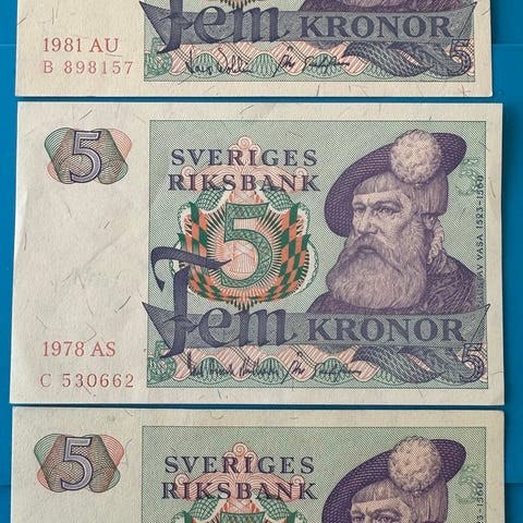 3X Sverige usirkulerte 5 kroner sedler 1973, 1978, 1981 pris inkl porto