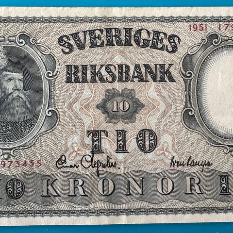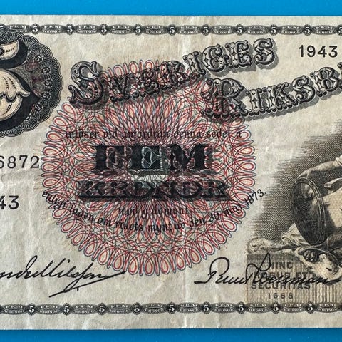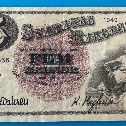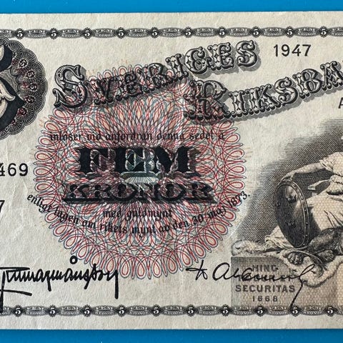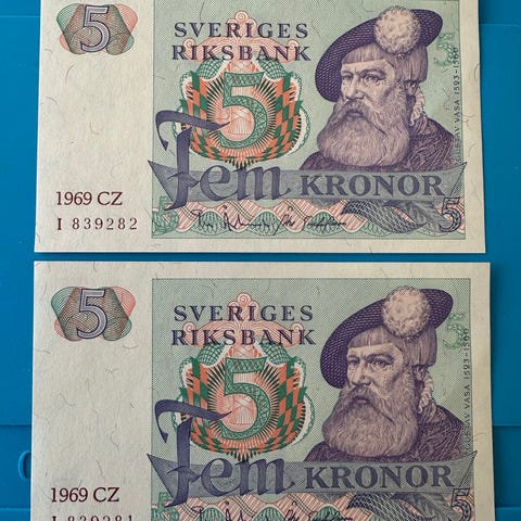 Sveriges Riksbank 5 kroner sedler fra 1973 1978 og 1981, alle er usirkulerte og framstår som helt nye.